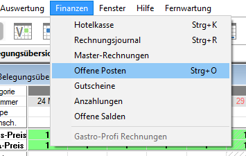 - klicken Sie im Menü auf "Finanzen -> Offene Posten" und wählen Sie im sich öffnenden Fenster die Lasche "Anzahlung"