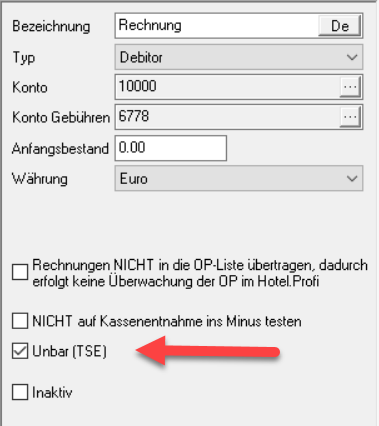 - Zahlungswege, hier gibt es eine zusätzliche Option "Unbar TSE", die ausschließlich für die TSE benötigt wird