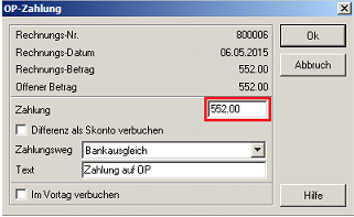 - mit Klick auf „Ok“ ist der offene Posten als bezahlt markiert und ausgebucht