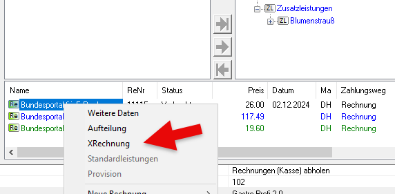 Um eine E-Rechnung oder X-Rechnung zu versenden, klicken Sie auf die Rechnung im Mini-Rechnungsjournal der Reservierung und rufen über das Kontextmenü den Menüpunkt XRechnung auf.